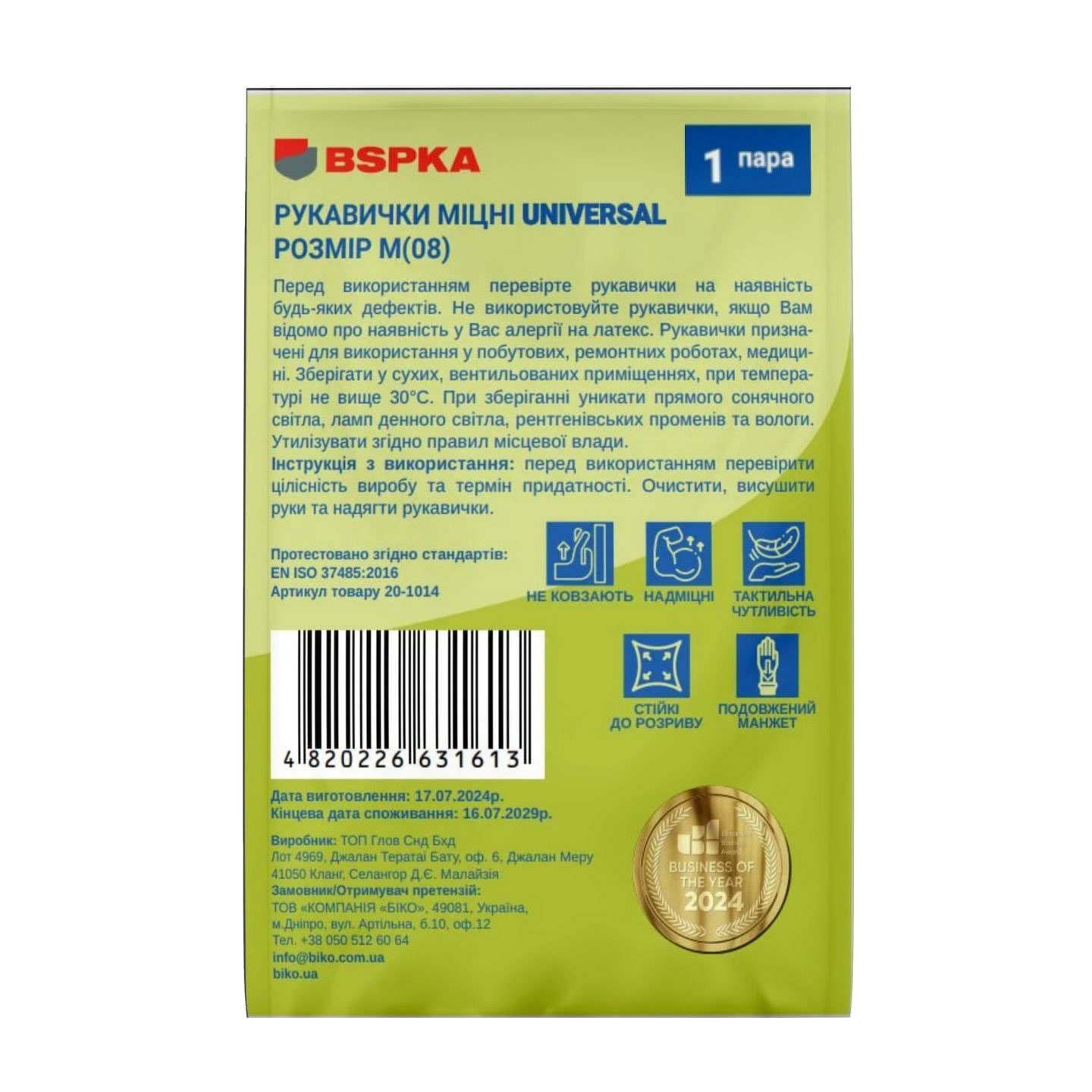 - EN ISO 374-5:2016 – міжнародний стандарт, що підтверджує захист від мікроорганізмів та хімічних речовин.
